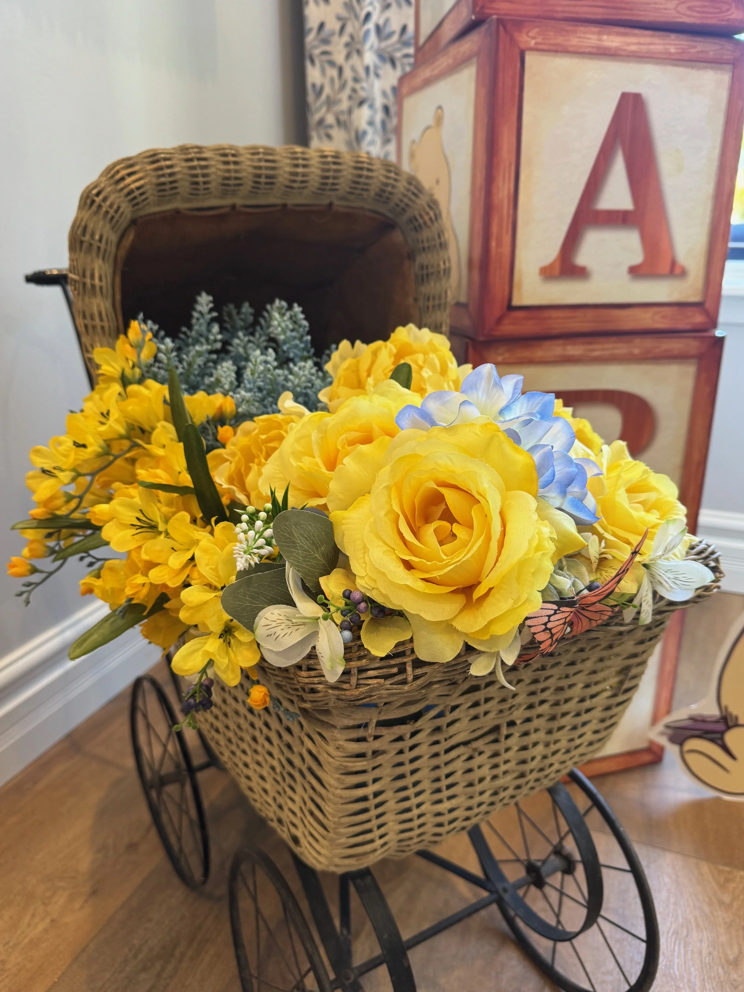 Styled with silk flowers in your desired color hue. Vinyl personalization and decals available. Available as an add-on to a full-service order (may be placed as a standalone order along with 6ft+ balloon garland depending on delivery location).